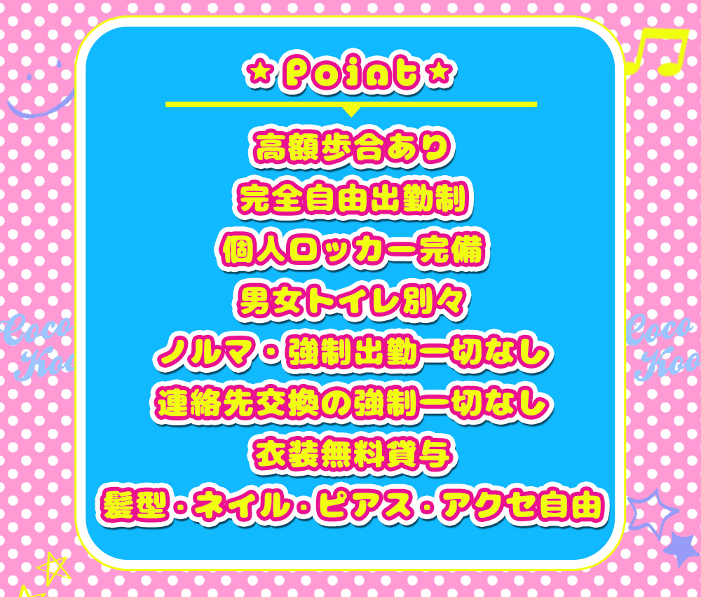 未経験で入店しましたが、お店の雰囲気や女の子同士の仲が良く、最初は不安でしたが今では楽しく働けて選んで正解でした!